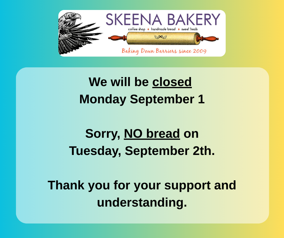 “The mission of the Skeena Bakery is to produce outstanding natural, handcrafted bread and baked goods for our retail and wholesale customers in north western British Columbia.”